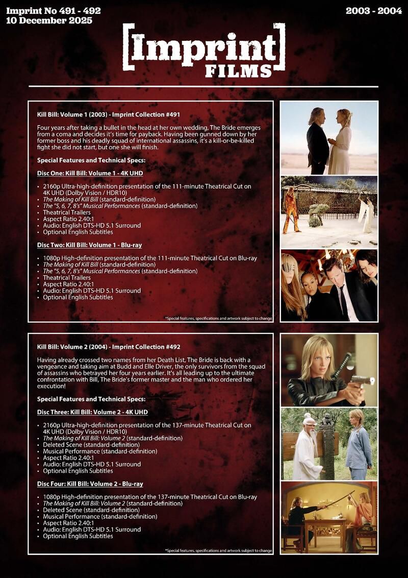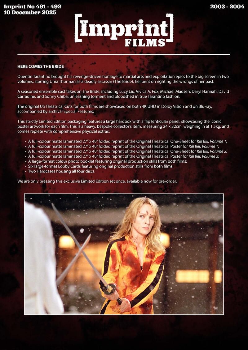 Australian label Imprint Films has informed us that it will release on 4K Blu-ray Quentin Tarantino’s Kill Bill: Volume 1 & 2 (2003-2004). The two releases are scheduled to arrive on the market on December 10.