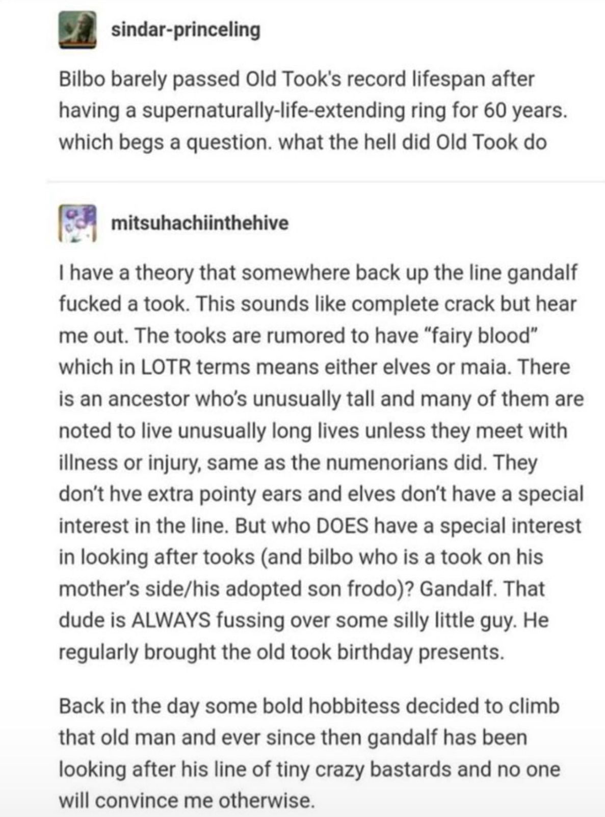 I’m sure there are other explanations than Gandalf loving and sleeping with a Took sometime in the past…but there aren’t really any simpler explanations that include the familial (possibly genetic) aspect.