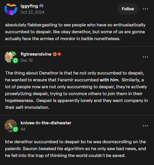 And the people proselytizing despair get away with it because toxic positivity has been such a powerful negative force. Hope isn’t smiles and ignorance, it’s riding to the black gate trusting that Frodo and Sam are doing their jobs even though you can’t personally see them.