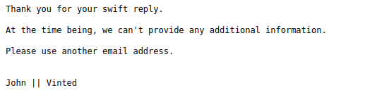 I just wanted to register on Vinted to sell some second-hand stuff, because I haven’t had much success elsewhere. I would have never imaged that they will reject my addy.io alias. After a couple of annoying e-mails detailing how to register an account, I was left with the answer on the screenshot after trying to get an explanation why the domain I am paying for (not some random free gmail address) is not worthy of their services…