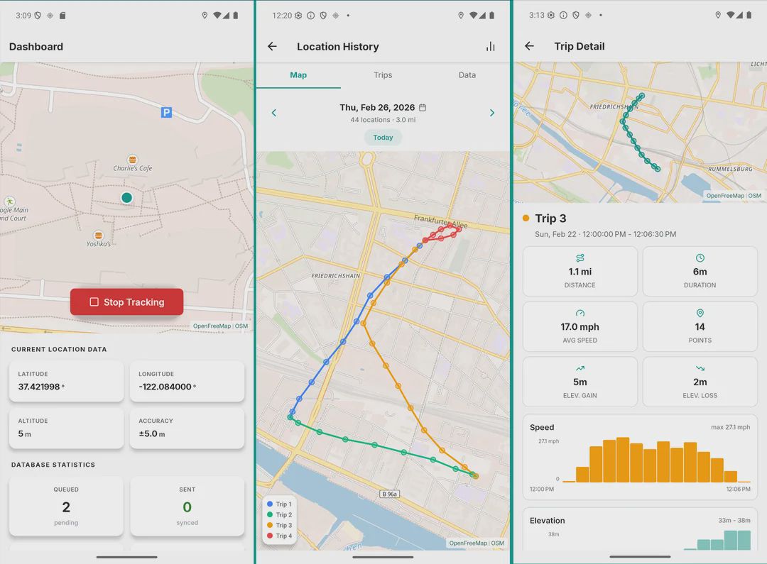 - Automatic Tracking profiles which apply different tracking settings while e.g. being connected to Android Auto, moving slower than 6km/h or while the phone is currently charging.