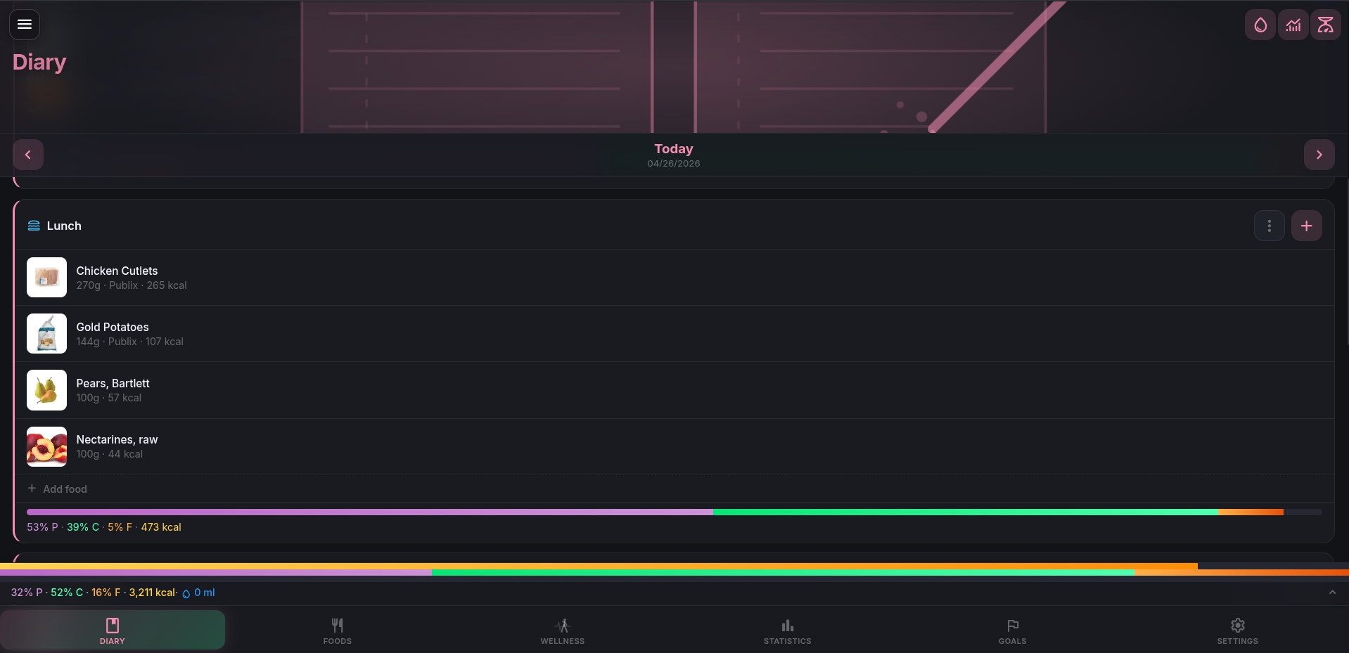 Daily food diary with multi-ingredient meals, recipes, body stats, water tracking, day-level notes. Personal food database, barcode scanner, imports from Open Food Facts and USDA, plus optional Mealie integration. Statistics with trend charts, full backup, exports as CSV / JSON / full ZIP.