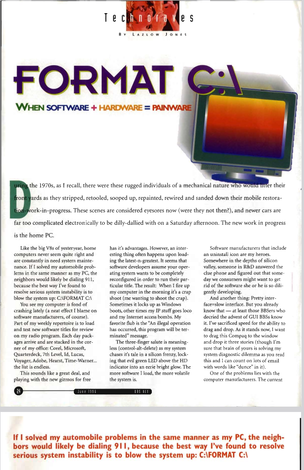 Did anyone host a BBS? I found this article kind of funny about ‘fixing’ WIndows by C:\FORMAT C:. Some things don’t change. LOL