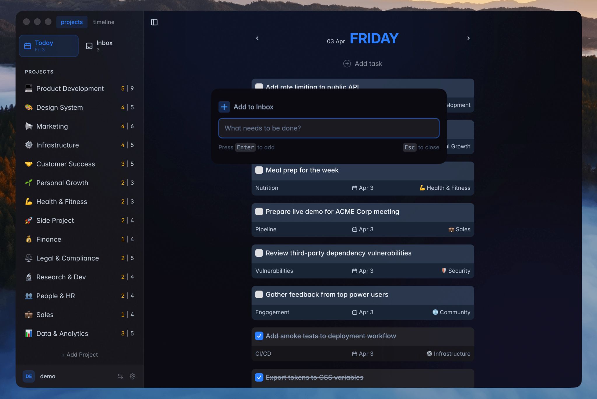 Modern offline-first self-hosted open-source TickTick/Todoist alternative. Now with desktop app and quick add global OS popup!
