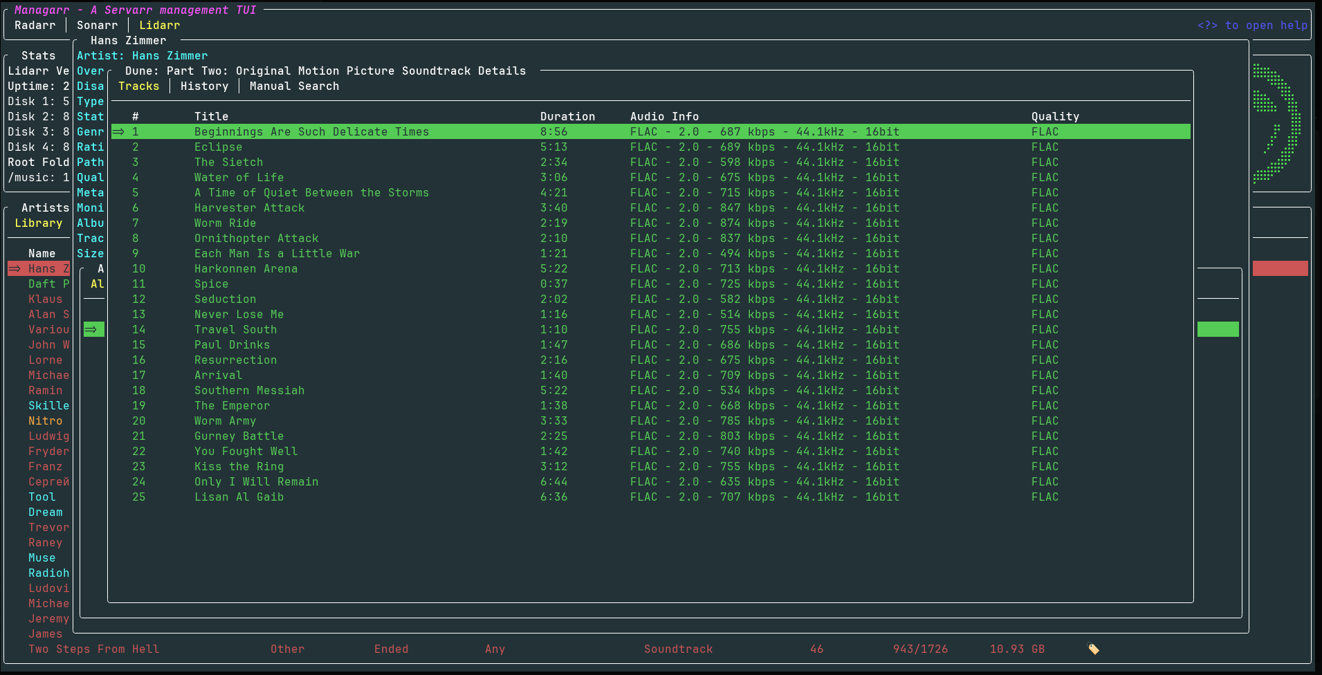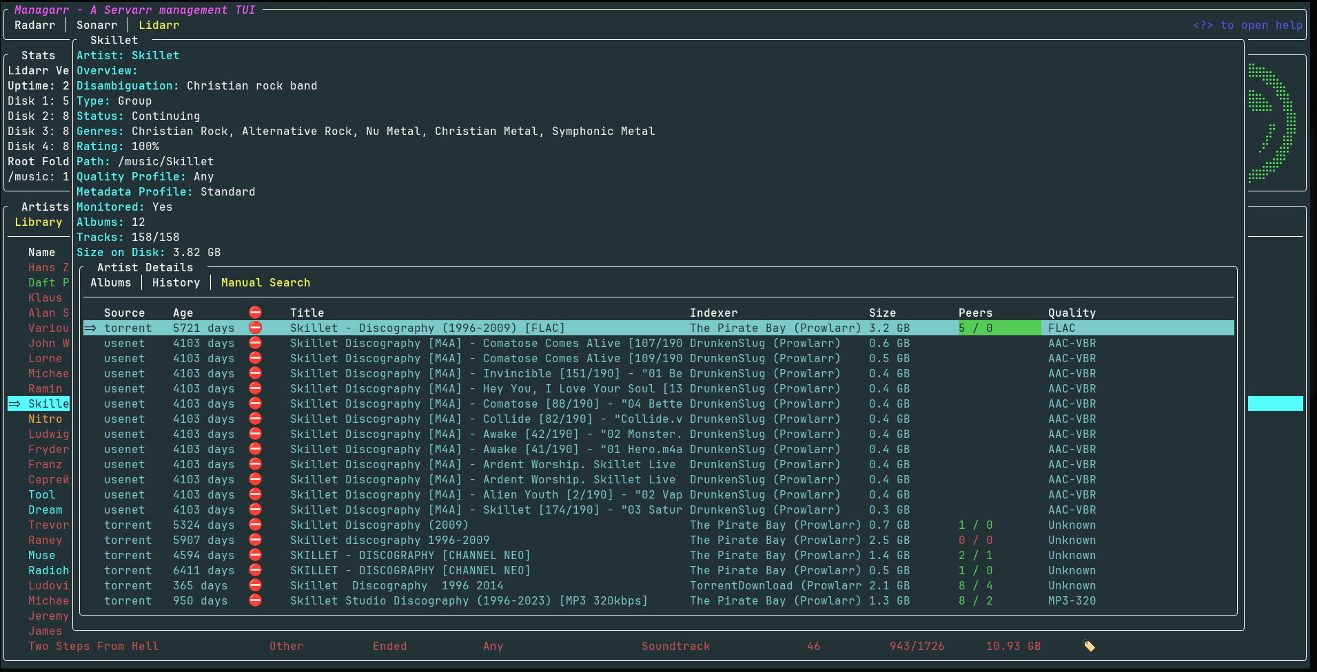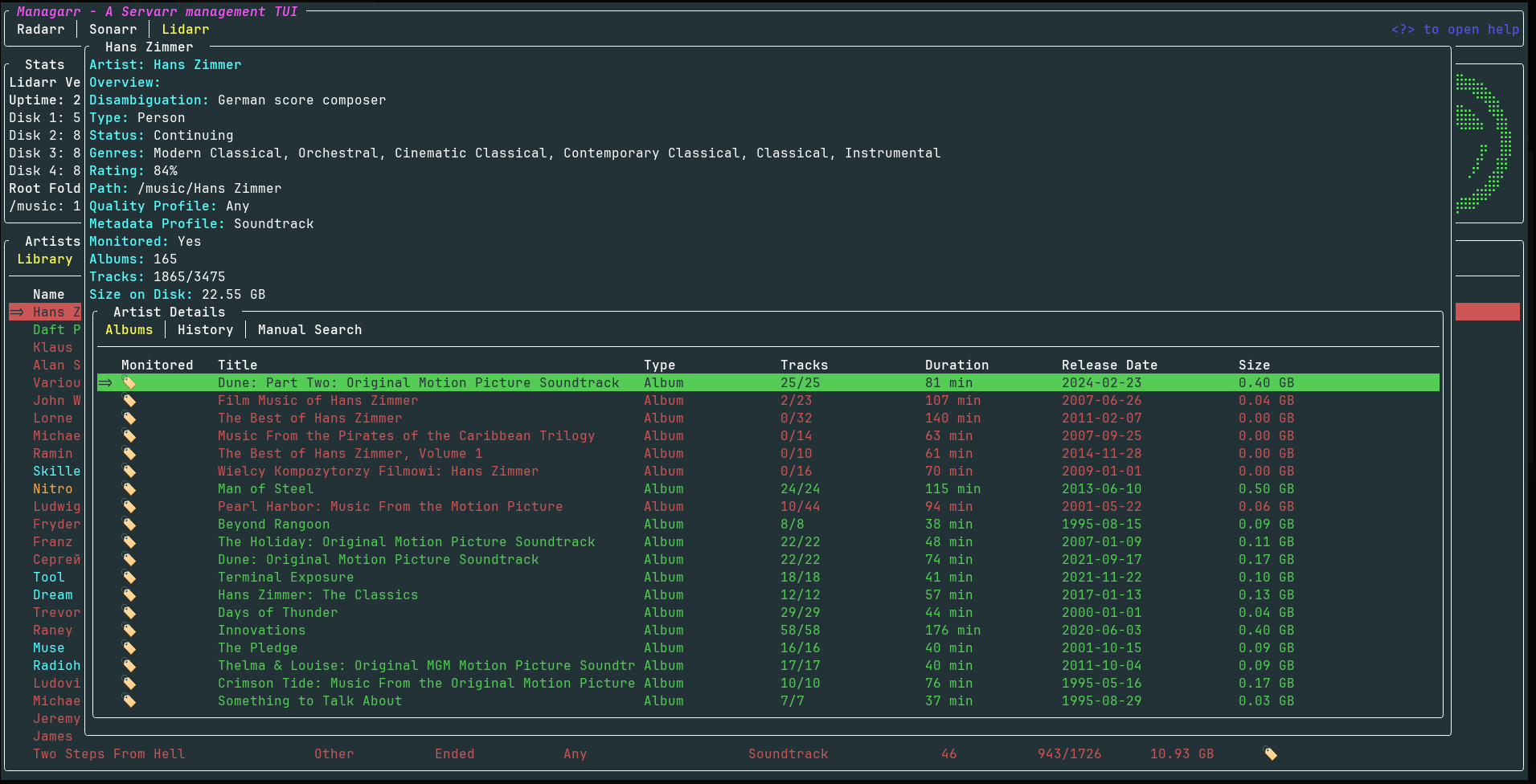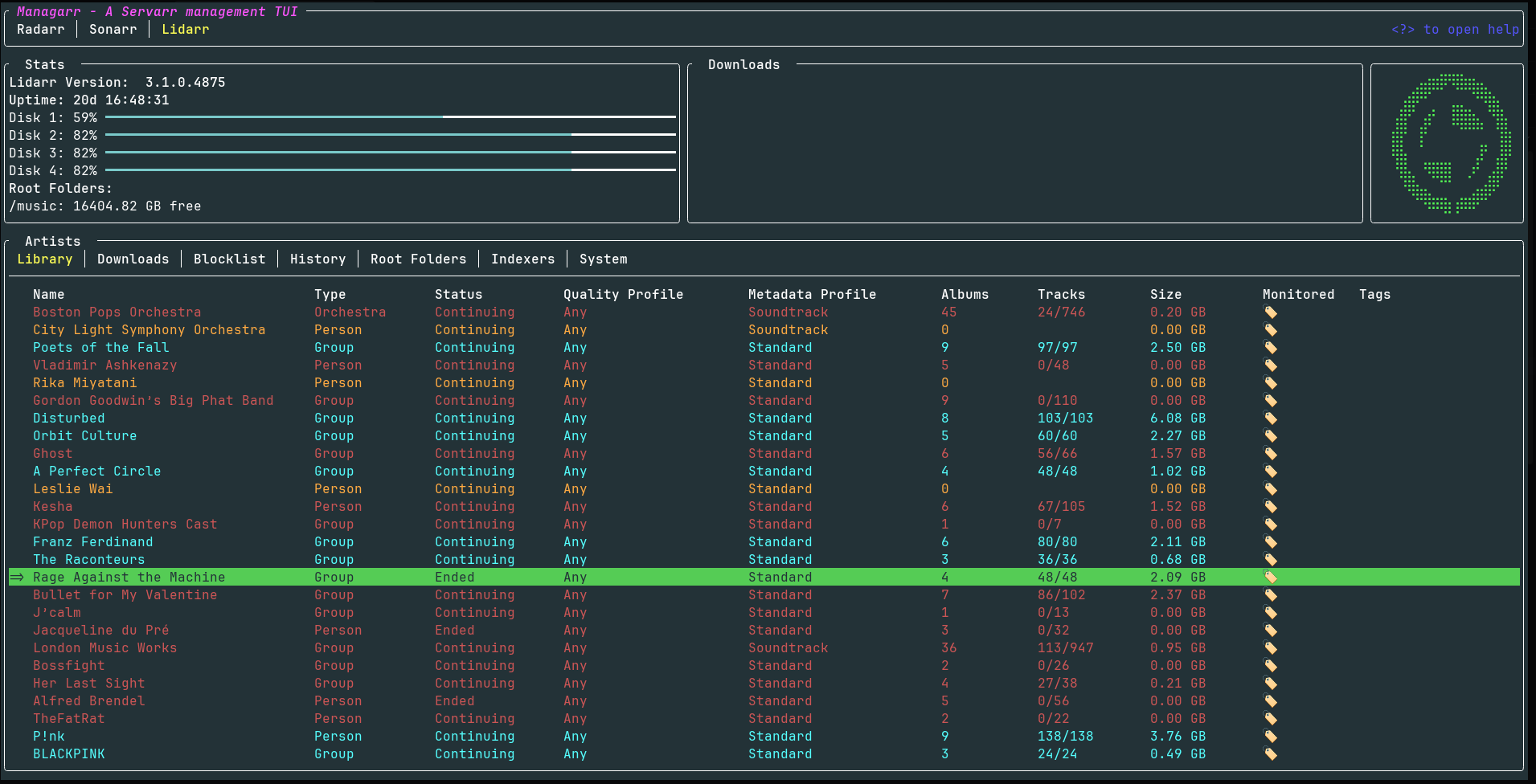 Managarr is a terminal-based application for managing all your Servarr instances from one place. It provides a user-friendly interface to interact with your media libraries, making it easier to manage your downloads, monitor your artists and albums, and perform various actions directly from the terminal.