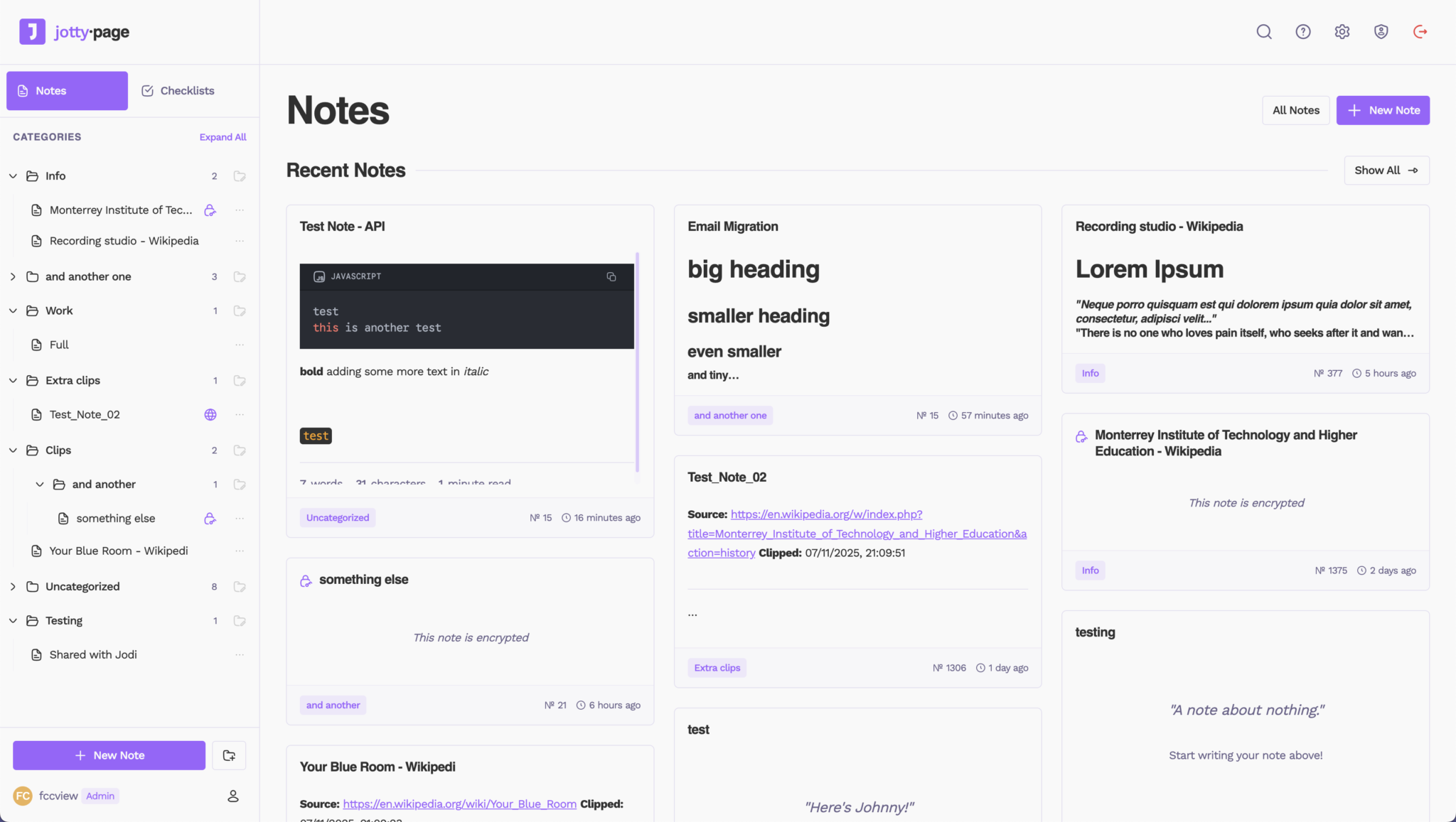 A self-hosted app for your checklists, tasks and notes. jotty·page is a lightweight alternative for managing your personal checklists and notes. It's extremely easy to deploy, keeps all your data on your own server with your own file structure (no databases!) and allows you to encrypt/decrypt your notes for your personal peace of mind.