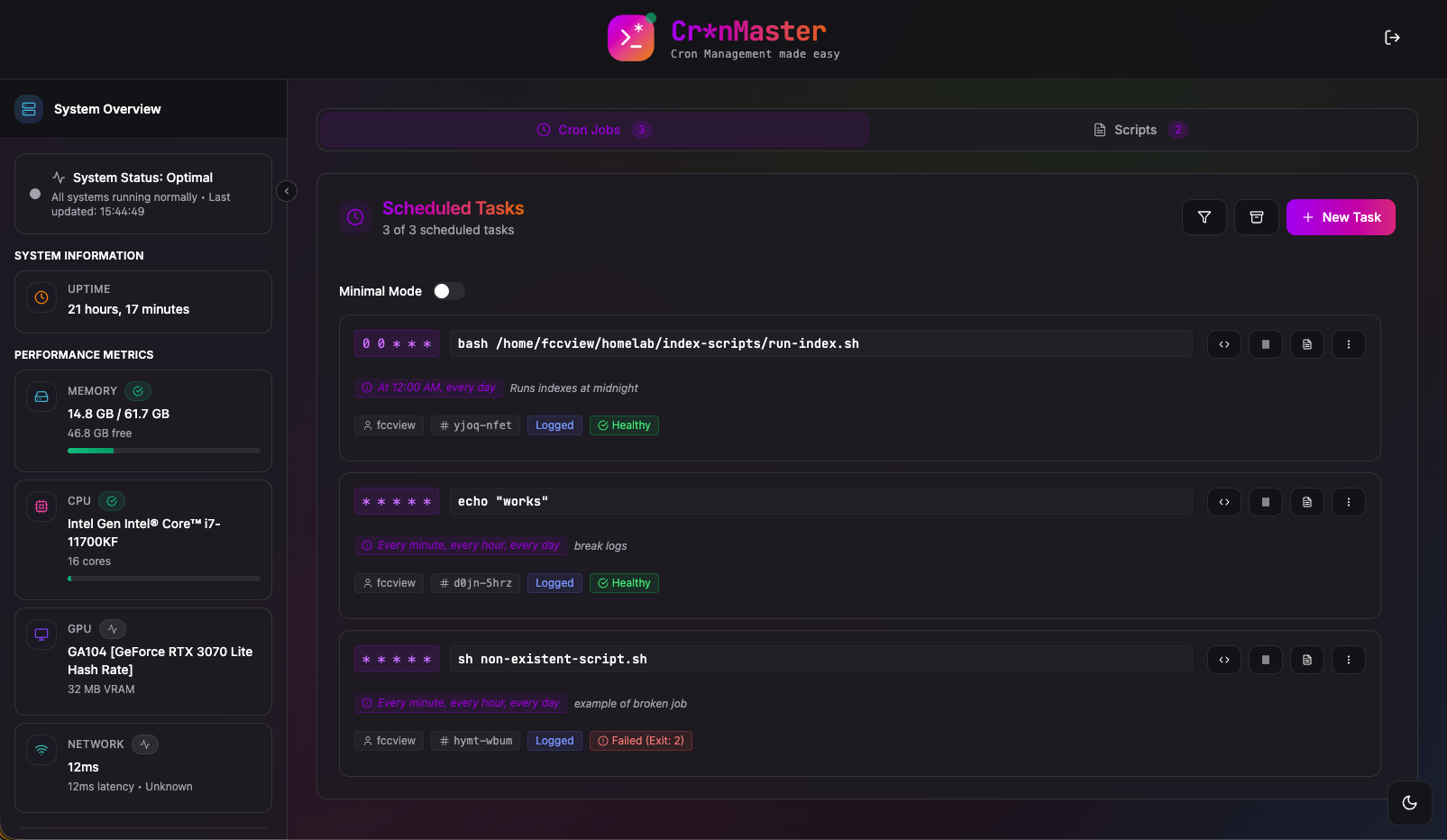 Cr*nmaster (cronmaster) is a pretty powerful tool that allows you to view/create/edit/manage all your host cronjobs comfortable from an intuitive UI, it has features such as pausing jobs, adding comment to them, running them right from the UI, and from the latest update you’ll be able to have nicely structured logs for your jobs on top of exit statuses being shown right there and then. You will be able to see if a job failed at a glance and view the logs to see what’s going on.