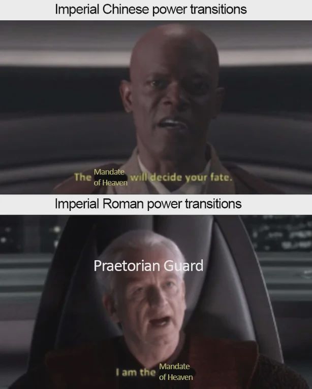 Explanation: In Imperial China, Emperors were often overthrown by losing the “Mandate of Heaven” - broadly speaking, the stability of the state, resulting in civil war.