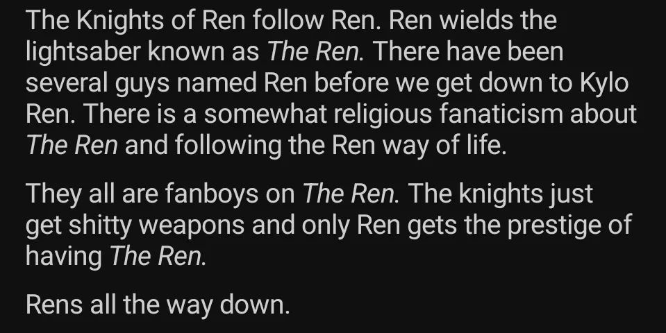 I remember hearing that that Sith guy from Acolyte (the one that killed all those Jedi singlehanded) was gonna be the original Ren. I guess he would have been a failed apprentice to Darth Plaguis or something. We’ll never know for sure though, because Acolyte sucked and was stupidly expensive for how bad it was.