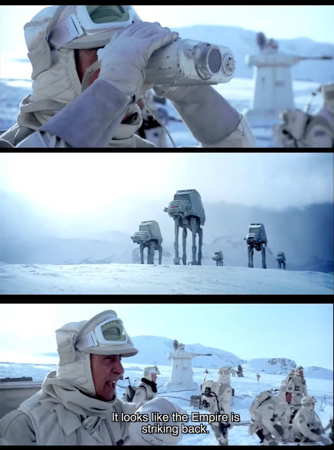 "We know everything we need to know just by the visuals. Rebels. Empire. We got a sense of how small and ill-equipped the rebels are and how large and powerful the Empire is. The low angle implies dominance, and the length of the Star Destroyer implies the Long Reach of the Empire. This shot says everything we need to know without saying one word. In fact, this is so genius, I have a feeling that George Lucas had nothing to do with it and probably fought against putting it in the movie."