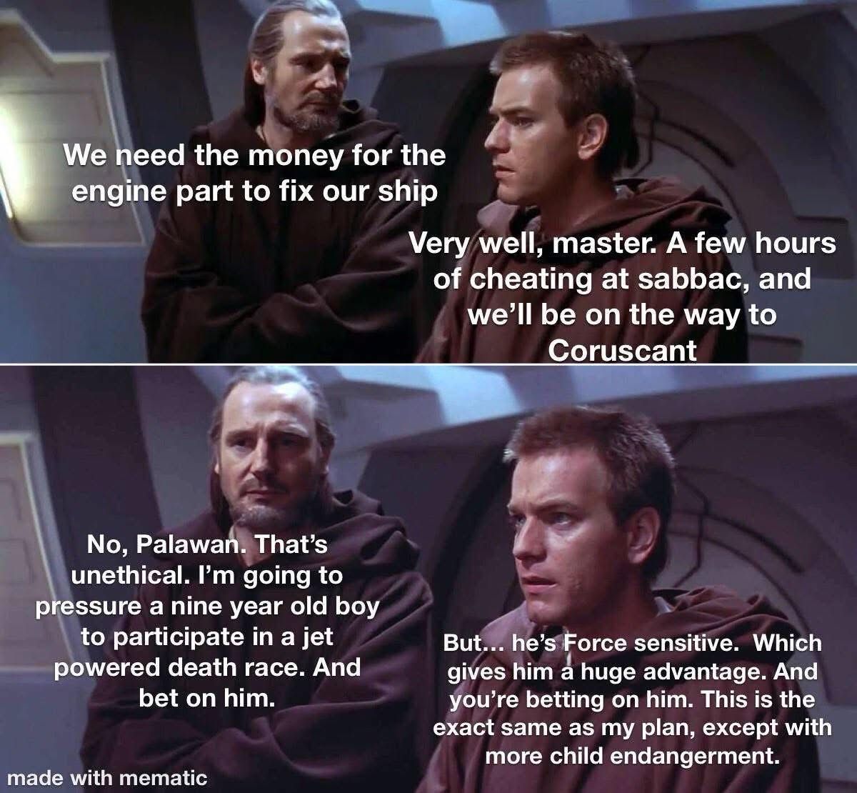 Actually, on second thought, a mother is a personal connection. Can’t have the Jedi making human connections because if they end up dying without heirs, the Jedi order usually gets most or all of their shit. We’ll just ignore the whole genetic component of force sensitivity (and also fail to discover that Anakin’s strength is because his father was literally the dark side of the force).