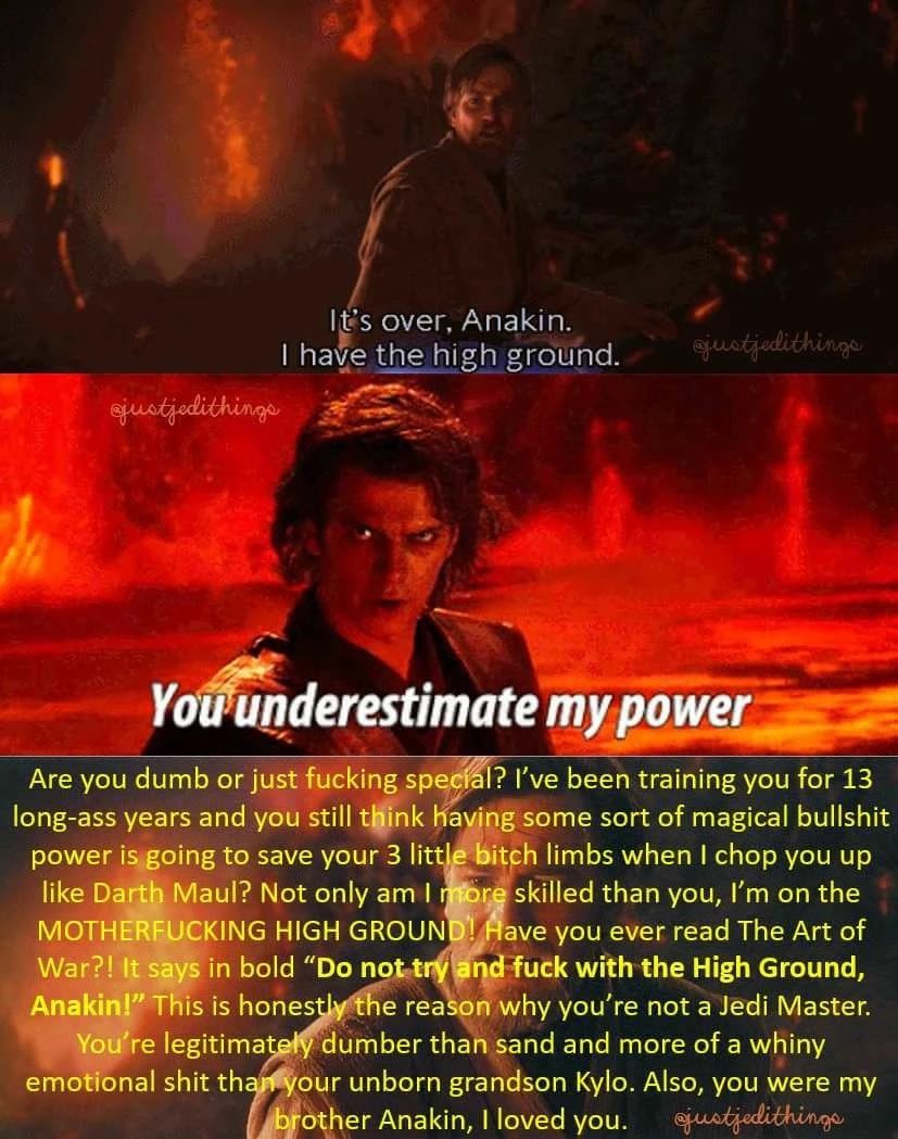 Anakin could have just used the force to pull Obi forward off his high ground and into the liquid hot magma so either he really didn’t wanna kill him or he was, in fact, stupid. 🤷♂️
